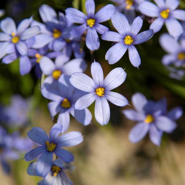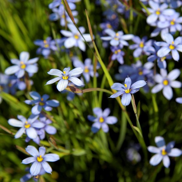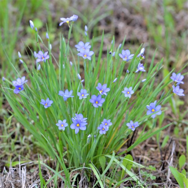 It looks like a grass, but it is actually from the iris family. Its leaves grow in grass-like clusters that form sweet little mounds that spread easily. Then for a few weeks each spring dainty violet-blue to sky-blue colored flowers cover it. This is an herbaceous perennial, which means it dies to the ground each fall, but quickly pops up again in the spring.