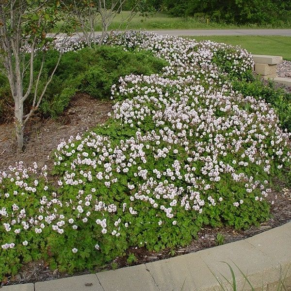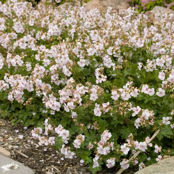 This type of Geranium is a dwarf variety that will grow relatively low to the ground. Fragrant dark green foliage has a rounded, deep-lobed leaf shape that turns into a brilliant red to orange-red color from fall right into winter. Low-growing plants spread slowly, and blooms late spring to early summer - sometimes light rebloom may be seen. Low-growing with flush after flush of bloom throughout the growing season! The deeply incised leaves form lush mounds through the entire growing season, even remaining evergreen in warm climates.