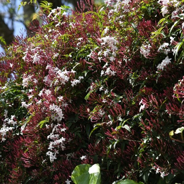 The glossy tropical dark-green foliage is gorgeous on its own, easily trained to cascade hanging planters or reach for the sky on a trellis. All late winter until spring, when you need it most, these fast-growing vines become smothered in starry pink buds burst open to release their scent. The blossoms fade to almost white over time.