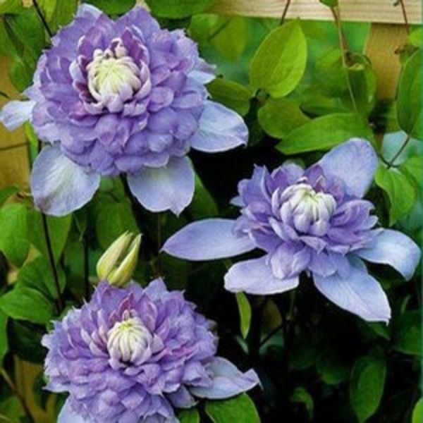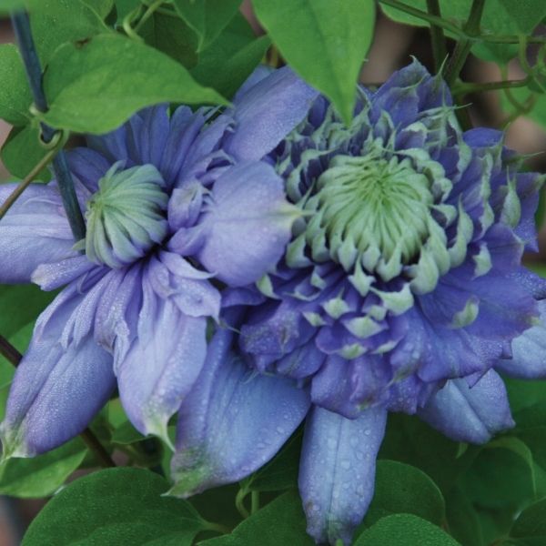 Clematis Blue Light, Clematis 'Vanso', is an exceptional Clematis that boasts fully double 5-6" flowers of violet blue.
