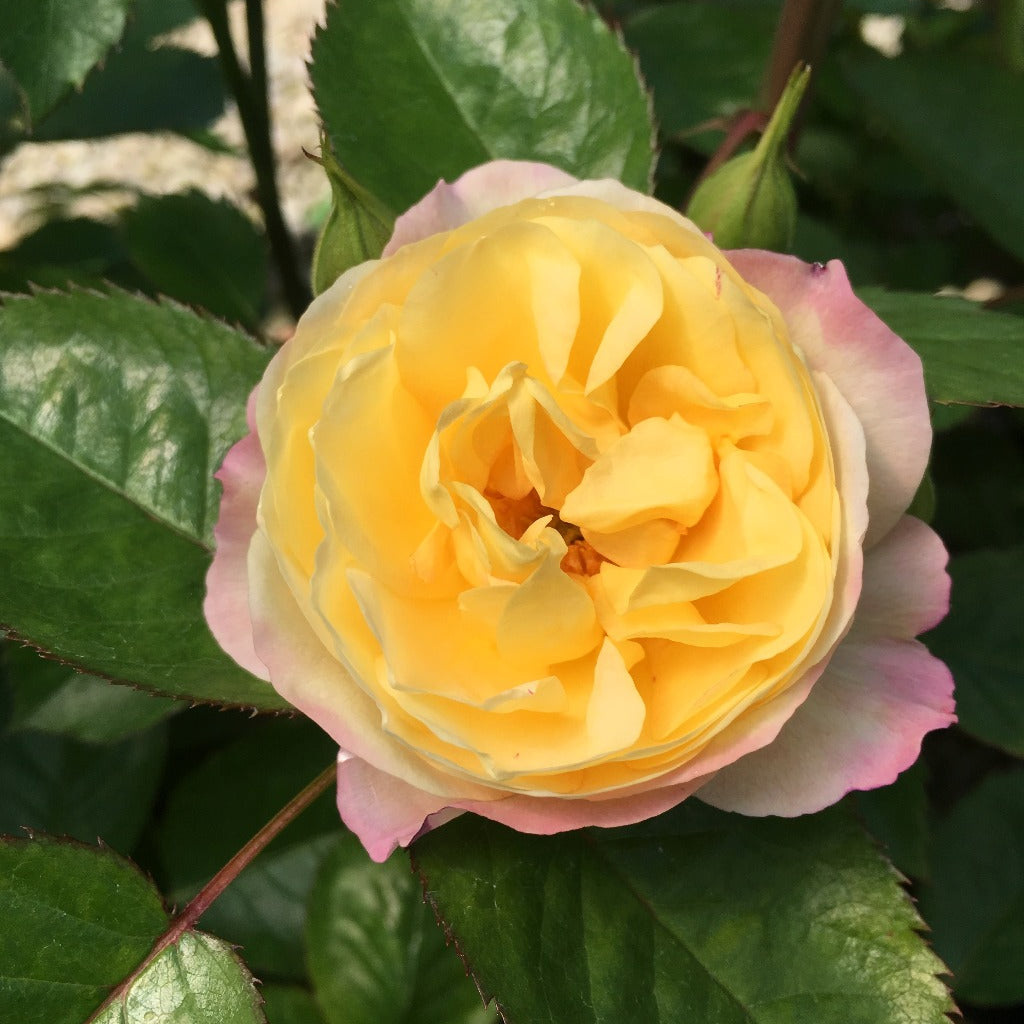 With gorgeously frilly, creamy-yellow blooms with gorgeously pink-kissed edges, this highly petalled rose variety is admired for its soft yellow centers that blush to a cheerful pink. Not only are these large blooms a pastel dream, but their petal pattern is less of a rosette and more of a staggered grouping of rounded petals. The dreamy, old-fashioned flowers are lovely English-style double-petalled forms that draw admiration from everyone in the neighborhood, as well as all of the area pollinators!
