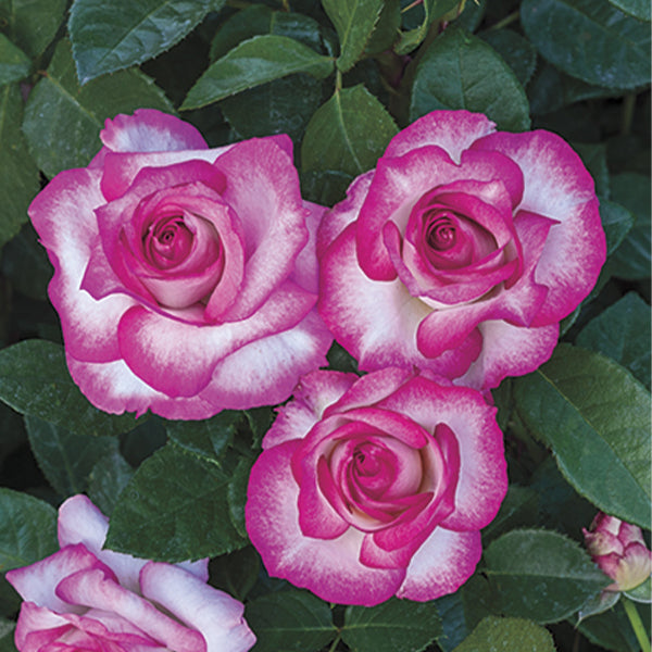 If you haven't seen this rose already, then you have probably heard of it. The Grandiflora Miss Congeniality™ Rose (Rosa 'WEKpurmebep') effortlessly stands out amongst the crowd with its natural beauty. The white blooms with striking pink edges pop out even more drastically on top of its glossy, dark green foliage.