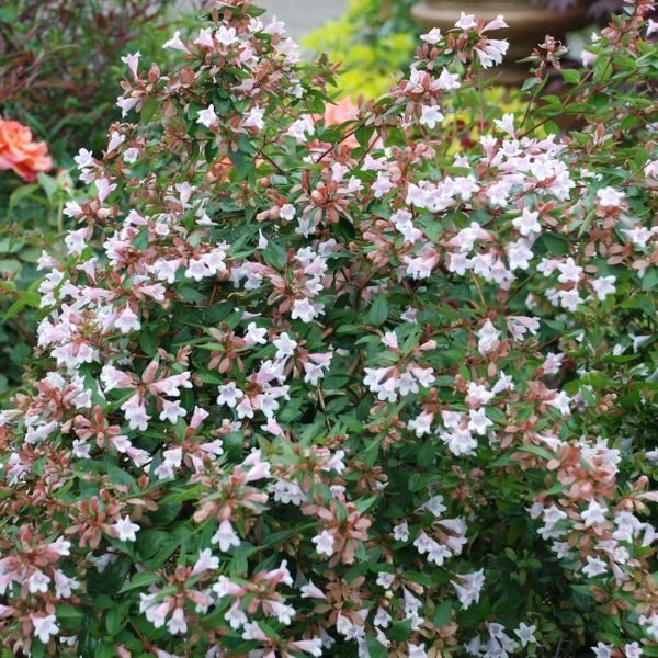 Add just one Pink Abelia near an entryway to welcome guests in style. Or, use several in a low, informal hedge. For a fast result, plant them two feet apart on center, measuring from the center of one to the center of the next. Mass plantings allow you to appreciate the graceful arched form fully. Add successive rows in a staggered, zigzagging planting pattern, then mulch between plants until they grow together and touch.
