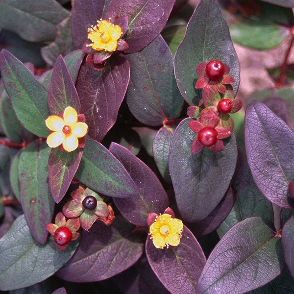 Bright yellow blooms with golden sparks shooting from the centers, plus brooding, reddish-purple foliage and red to black-berries! That's what Albury Purple St. John's Wort (Hypericum androsaemum 'Albury Purple') brings to your landscape!