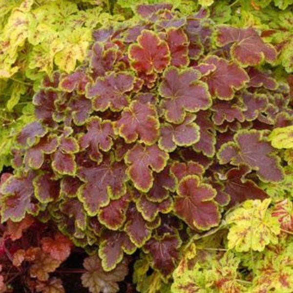 Out of this world color, the Solar Eclipse Foamy Bells PP23647 (xHeucherella 'Solar Eclipse') is an evergreen perennial with fabulous bi-color foliage. The gorgeously lobed leaves have a cinnamon-red center with a lime-green border for a standout two-tone show!