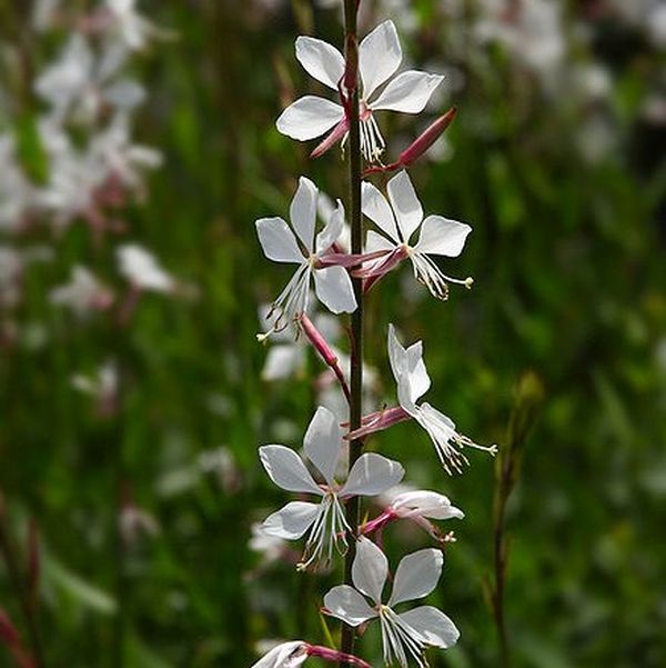 Whirling Butterflies Gaura (Gaura lindheimeri 'Whirling Butterflies') brings graceful movement to your garden. Creating mounding clumps with an airy feel, and filling out with lance-shaped green foliage all summer. Long, slender red stems, full of pink buds open in succession from bottom to top into fluttering, unusual white blooms!