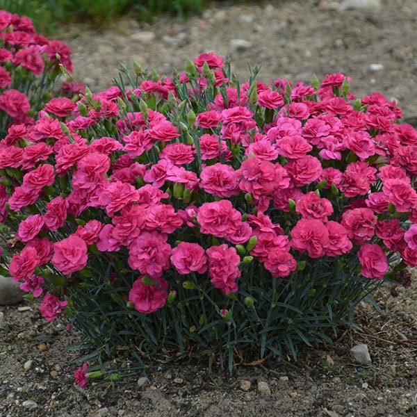 Raspberry Ruffles Dianthus has fully double, raspberry pink-colored flowers that are a whopping 1 and ¾ inches across (HUGE for a cottage pink). Every petal has a serrated edge that is outlined with a thin but distinct white line that really makes the raspberry color glow! And unlike other flowers that fade as the season wears on, Raspberry Ruffles keeps its strong color without fading. The flowers are extravagantly ruffled and lightly fragrant with the scent of cloves. These lovely blossoms are backed by a compactly-growing mound of dainty pointed blue-green leaves.