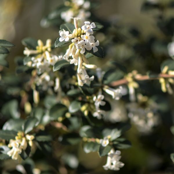 Delavay Osmanthus is a great evergreen for your garden in zones 7-9 and makes a smashing background for your mixed border or foundation planting. It has as outstanding jasmine-like scent that needs to be near windows and walkways for enjoyment. It grows dense enough that it can even be sheered for topiaries and formal clipped hedges. The branches are also highly prized in upscale florists displays for their beauty and fragrance.