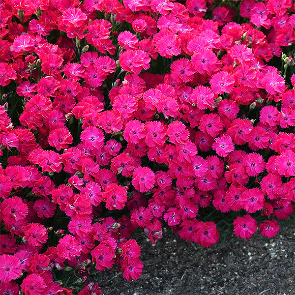 Early summer blooming, Garden Pinks have magenta red, bright-colored flowers that completely cover the plant. Each with light-pink 'eyes'.