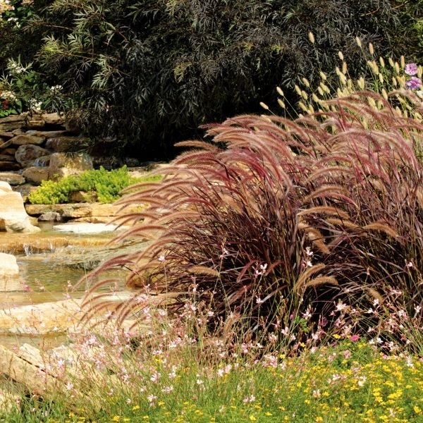Plant Purple Fountain Grass in full sun to develop the best blooms. Plant in well-drained soil of almost any type and provide moderate moisture as needed. Warm-season grasses green up later in the spring, but really shine once the hot, dry summer weather kicks in!