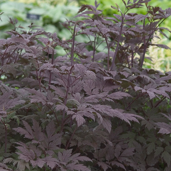 Dark and dramatic fine-textured foliage, the mysterious Hillside Black Beauty Bugbane (Actaea simplex 'Hillside Black Beauty') is an incredible perennial with dark purple-maroon, coppery blushed, lacy leaves with a dark green undertone. They add depth and pensive color to the shade garden!