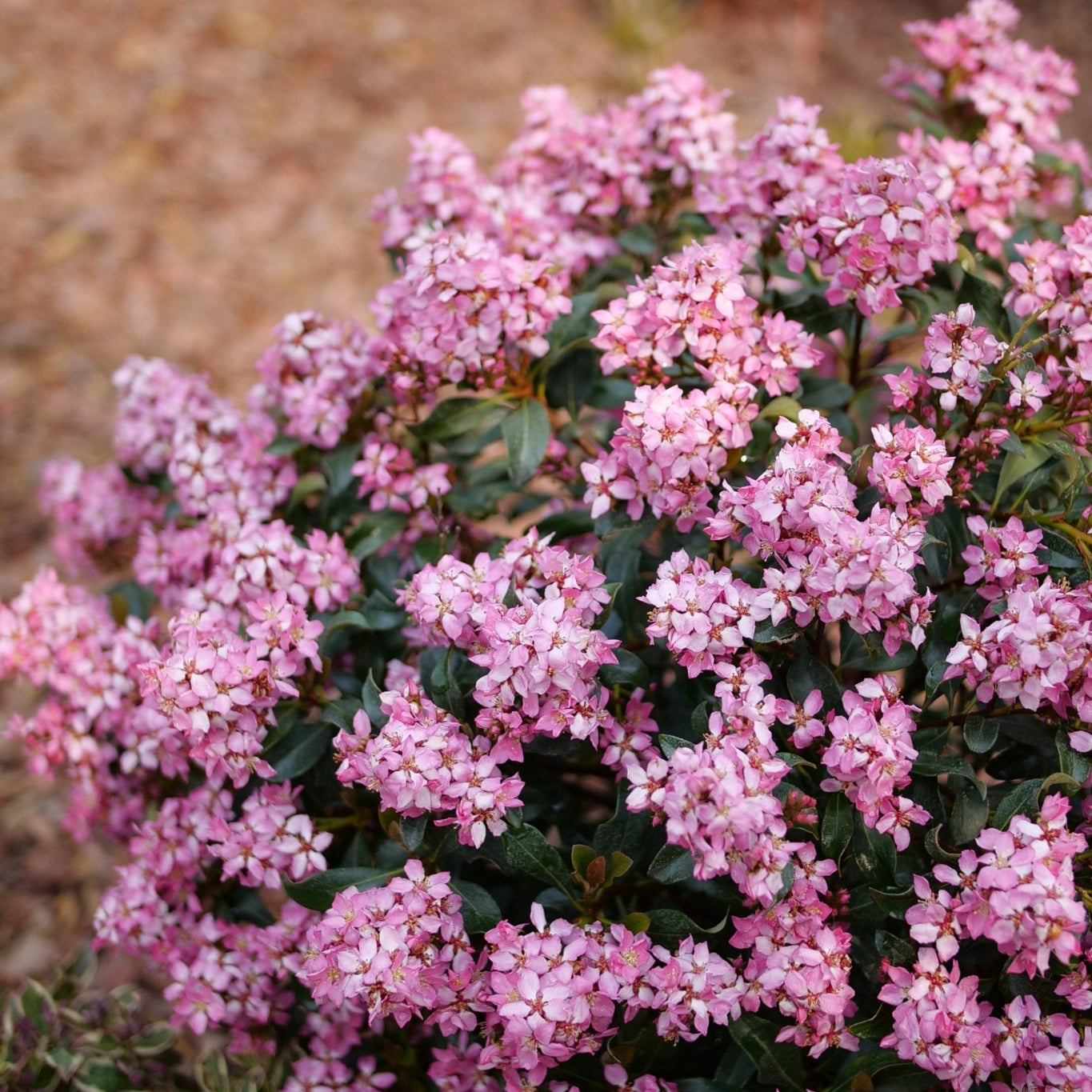 Rhaphiolepis indica 'SMNRICS' -- sold as La Vida Más® Indian Hawthorn -- took years to develop, and it shows. Where traditional Indian Hawthorn varieties give you a few weeks of spring color and spend the rest of the year as a quiet green mound, La Vida Más® keeps producing clusters of soft pink flowers from spring all the way through fall. The blooms are star-shaped with a warm yellow eye, carried in dense clusters that hover above the glossy, deep blue-green foliage in wave after wave of color.