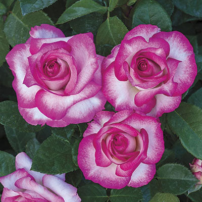 The flowers on this Grandiflora are born in clusters and are something else. The edges of this double-ruffled petal are a deep fuchsia and gradually lighten towards the middle until they're an almost pure white to pale pink. This two-toned bloom seems to float poised atop textured dark green foliage, ever working on its pageant wave in the breeze.