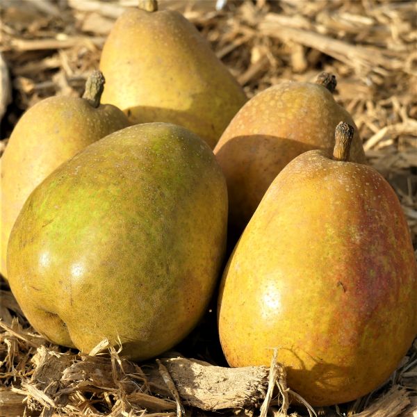 A late-season harvest time, the medium-sized, yellow fruit has a lively green tint and occasional red blush. Long-necked and tear-drop shaped, these juicy pears have a buttery, smooth white flesh that’s sweet and juicy!