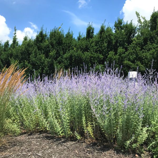 Russian Sage is the quintessential drought-tolerant perennial, filling the midsummer garden with an airy, shimmering haze of lavender-blue flowers that float above aromatic silver-gray foliage like a lavender field in Provence. Growing 3–5 feet tall, its silvery-white stems and finely cut, aromatic gray-green leaves provide textural interest from spring through fall, while the long panicles of tiny lavender-blue blooms attract an abundance of bees and butterflies from midsummer until frost. Few perennials are more adaptable, beautiful, or easier to grow.