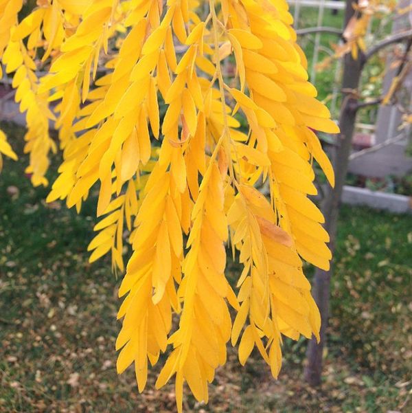 First, the tree casts a nice shade for you, but not such a deep shade that the grass or other plantings beneath it can't grow well. That's a plus for your lawn! The long odd-pinnately compound leaves are almost fern-like!