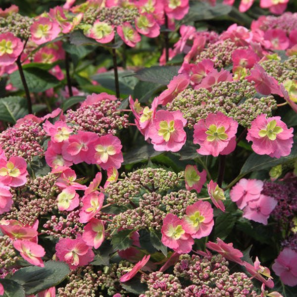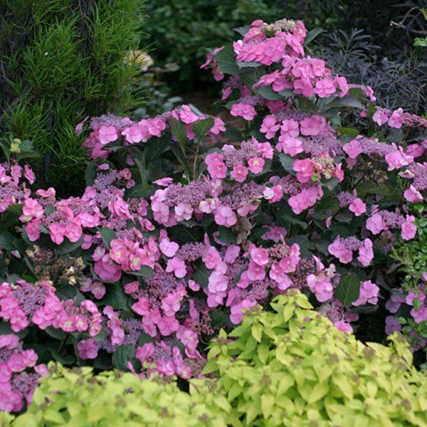 Almost an "everbloomer" you really need to see Tuff Stuff® to understand its sheer flower power. The blooms are semi-double to fully double in the classic lacecap pattern - tiny dark red or deep purple flowers are in a cluster surrounded by larger florets that are magenta pink or lavender-blue (depending on the soil pH).