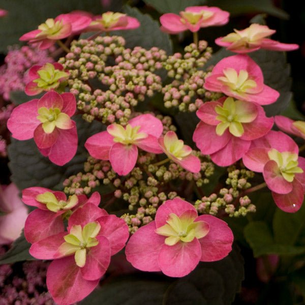 Pink and green lacy blossoms and textured deep-green greenery, Give your garden a big boost with the gorgeous lacecap blossoms of Tuff Stuff™ Red Mountain Hydrangea from NatureHills.com!
