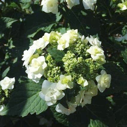 Each fully double, pristine white flower head that makes up this lacecap flowering shrub's many clusters, is like a perfect miniature bride's bouquet! The small double flowers in the center are surrounded by an outer ring of larger double flowers that give the entire shrub a lacey hand-embroidered effect. Despite being considered a lacecap, these are rounded clusters instead of flattened discs!