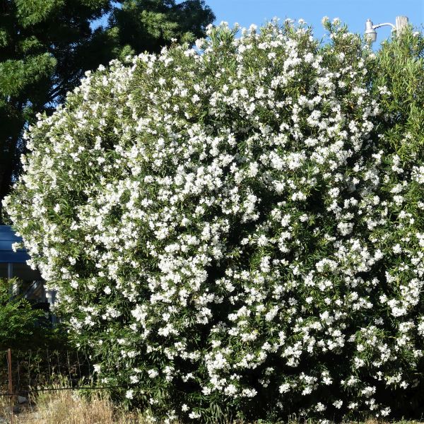 The White Oleander (Nerium oleander (white)) celebrates the natural world with its full leaves and clusters of blooms. This broadleaved evergreen is sure to create a lush and rich verdant feeling for your garden. The single white flowers produce a sweet and subtle scent.